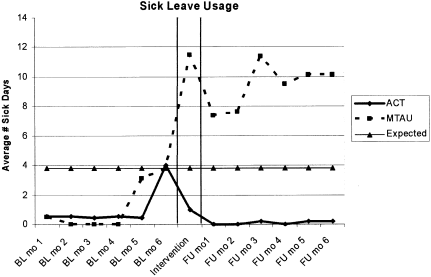 At post and 6-month followup, ACT participants showed fewer sick days and used fewer medical treatment resources than those in the MTAU condition, with a mean of 1 sick day versus a mean of 11.5 sick days for the MTAU condition.