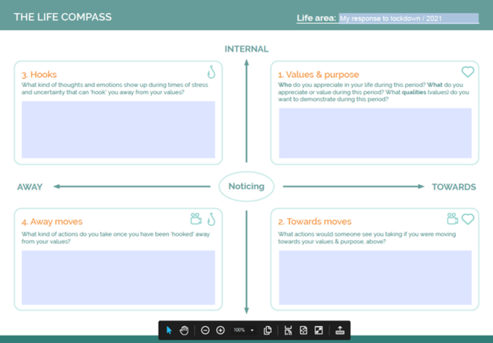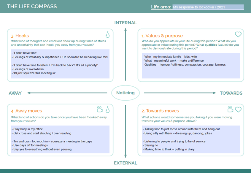 This tool is to help people to understand what really matters to them (even in adversity); what kind of actions move them towards their values, and how stress can sometimes ‘hook’ them away from that direction. It is designed to help guide people through tough times, just like a compass.