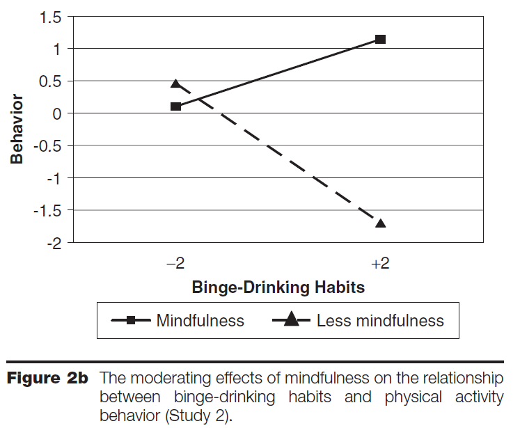 “These results, therefore, corroborate the view that greater awareness of and attention to internal states and behavioral routines helps mindful individuals shield good intentions from unhealthy habits and thus can play a key role in fostering effective self-regulation. In contrast, diminished attention and awareness of counterintentional routines and habits is likely to prevent individuals acting less mindfully from engaging in effective self-regulation, as the negative relationship between habitual binge-drinking and physical exercise suggests (see Figures 2a and 2b).”